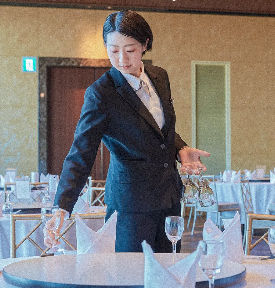 - レストランや宴会場でのお客様へのおもてなし。冠婚葬祭それぞれの目的にあわせて、きめ細やかなお声がけ、対応を行います。